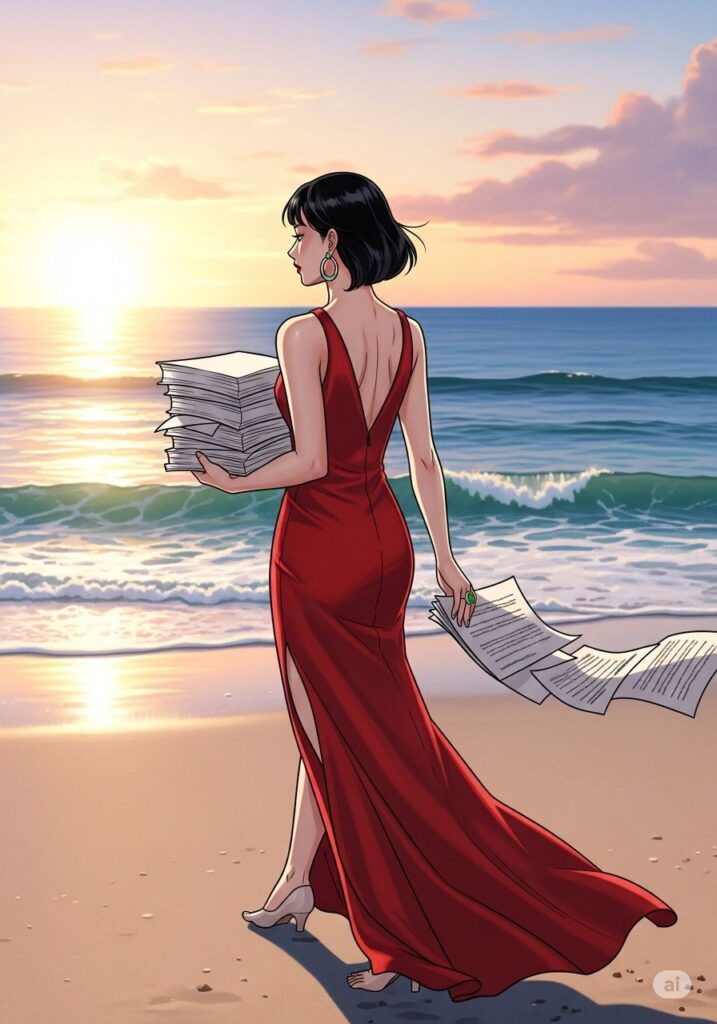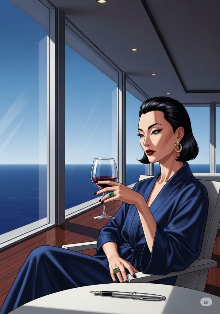 58歳の小説家、まなみは海辺のヴィラで、最後の一滴のワインを飲み干した。窓の外には、荒れ狂った昨夜の痕跡が砂浜に刻まれている。彼女は今、人生の「潜伏期間」にいた。物語は書けず、心は凪いでいる。けれど、彼女の瞳には、かつてないほど鋭い光が宿っていた。