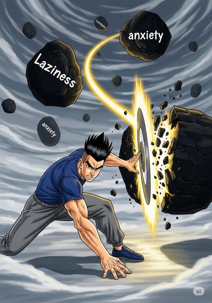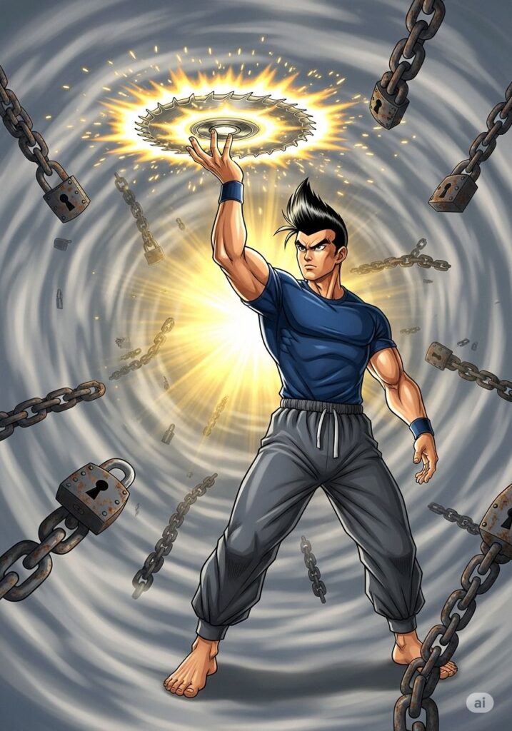 「いけっ!」やまとの叫びと共に、気円斬が放たれた。それは部屋に散らばった負のエネルギーを正確に切り裂き、彼の進むべき道を明確にしていく。不必要な娯楽、言い訳、そして自分を卑下する心。それらが真っ二つに割れ、光の粒子となって消えていく。視界が開け、進むべきゴールへの一本道が、やまとの前にはっきりと現れた。