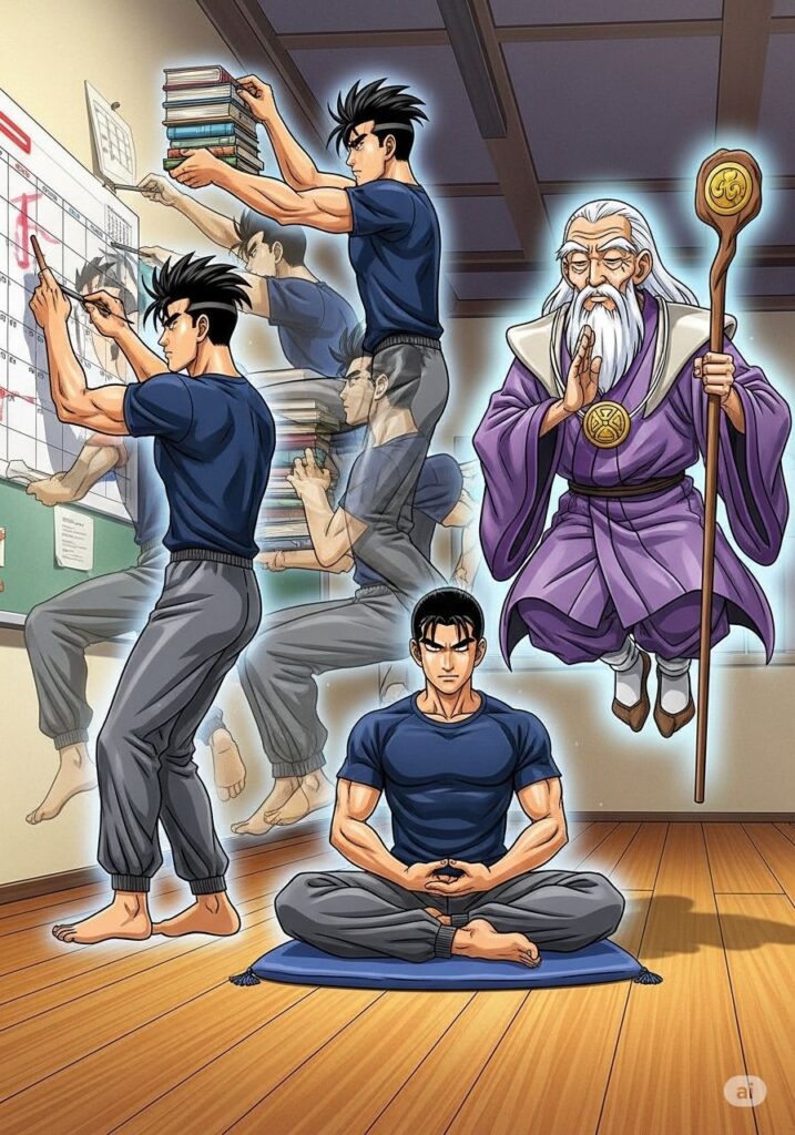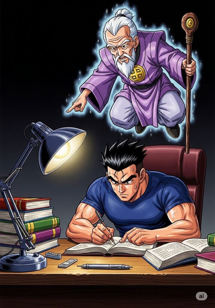 次のバトルフィールドは「進学」と「未来」という名の未知の領域だ。やまとは、重力100倍の精神と時の部屋――すなわち、自分自身の勉強机に向かった。そこで彼を指導するのは、不思議な浮遊感を持つ賢者、ゲン師匠だ。