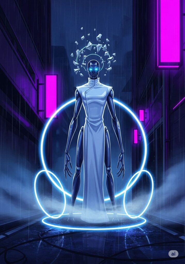 円環の影から、音もなく「ゼン」が姿を現した。システムの守護者であり、停滞の化身。彼は無機質な視線でジンを見下ろし、変化を拒む冷徹な圧力を放っている。