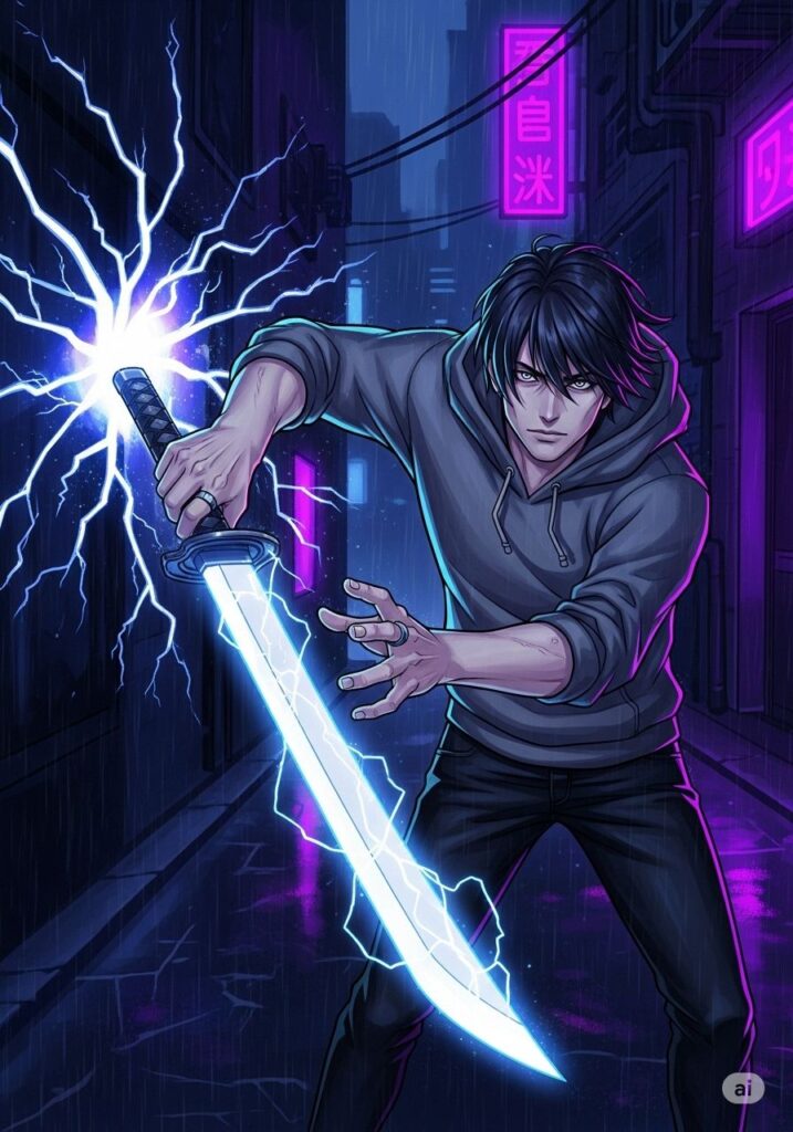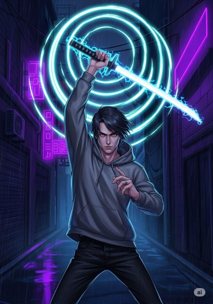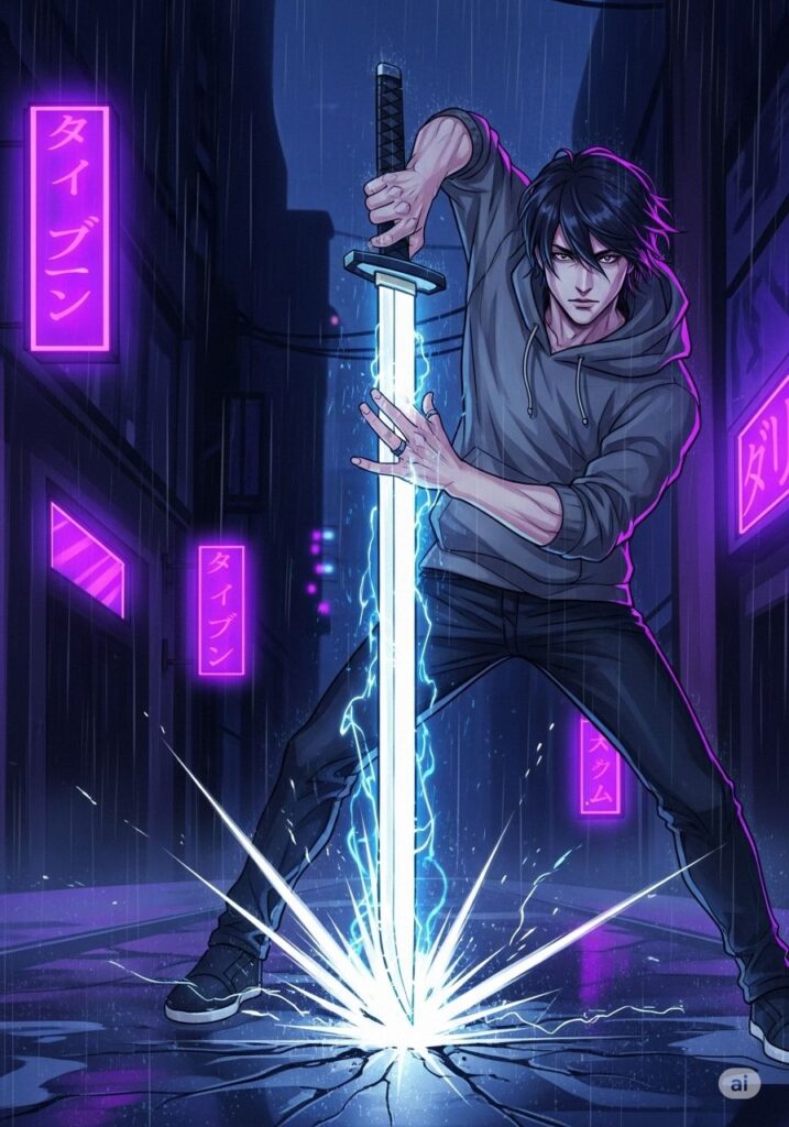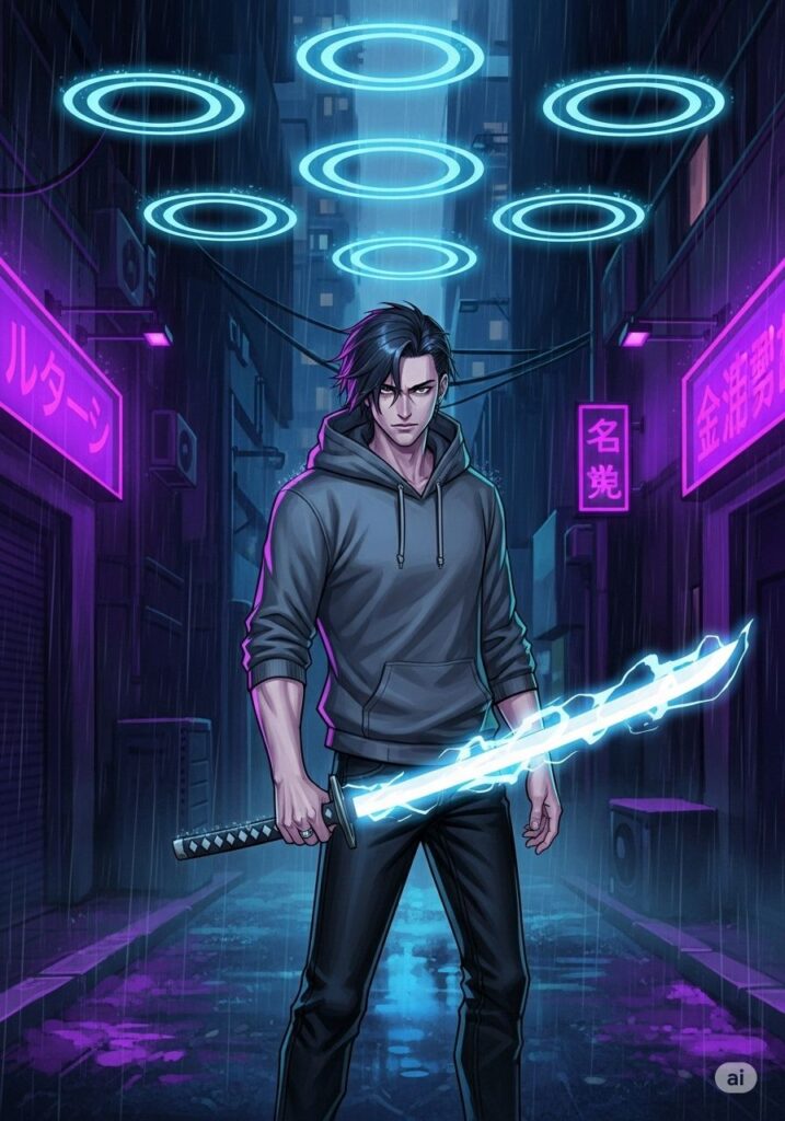 虚空に手を伸ばすと、そこには一本の日本刀が具現化していた。システムが凝縮された、非実体的な光の刃。ジンはその柄を強く握りしめ、かつてない重厚な感覚を掌に感じた。