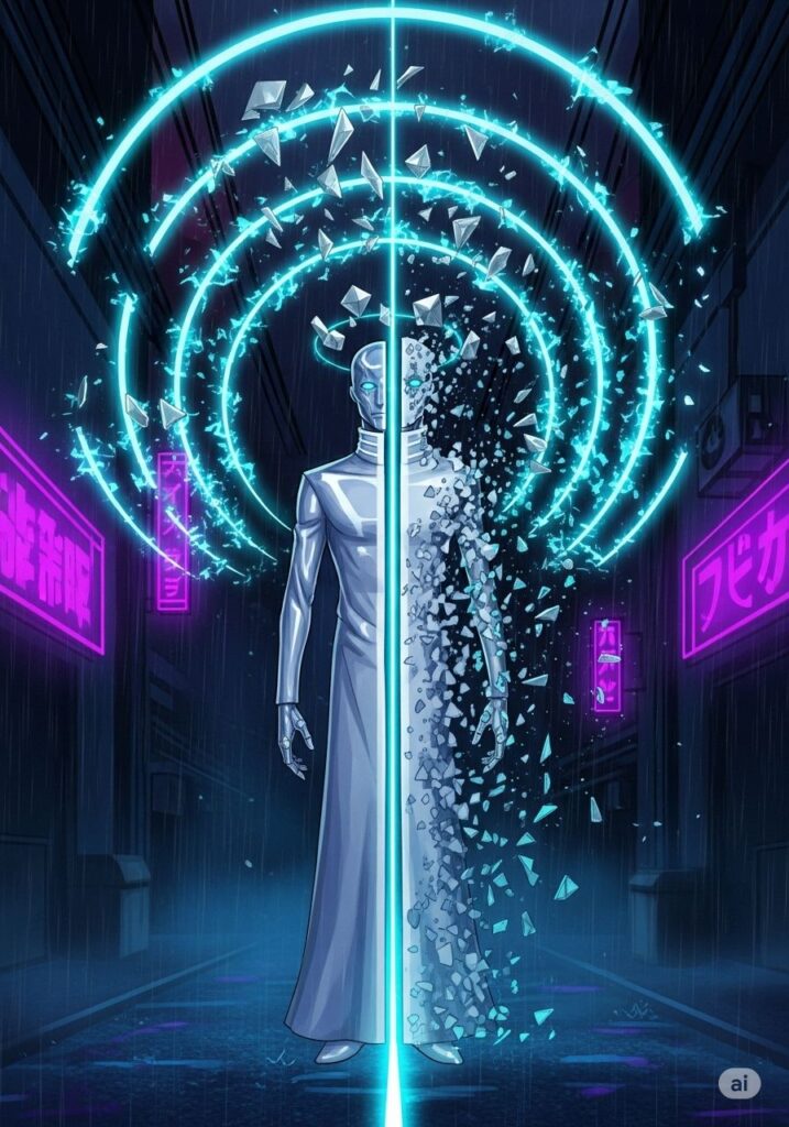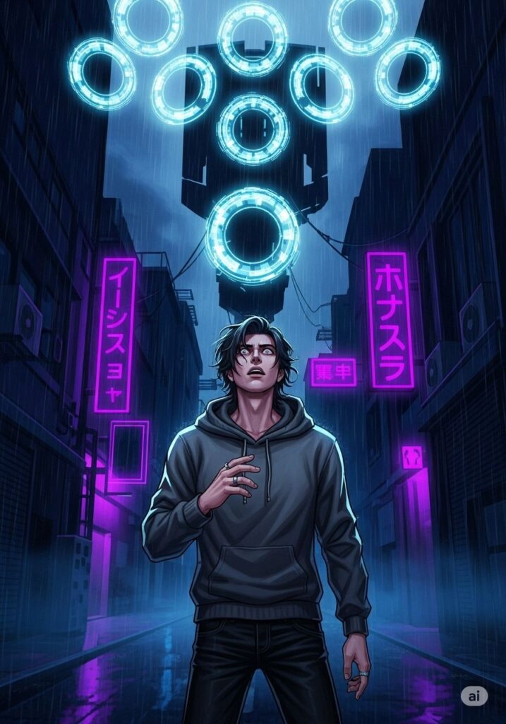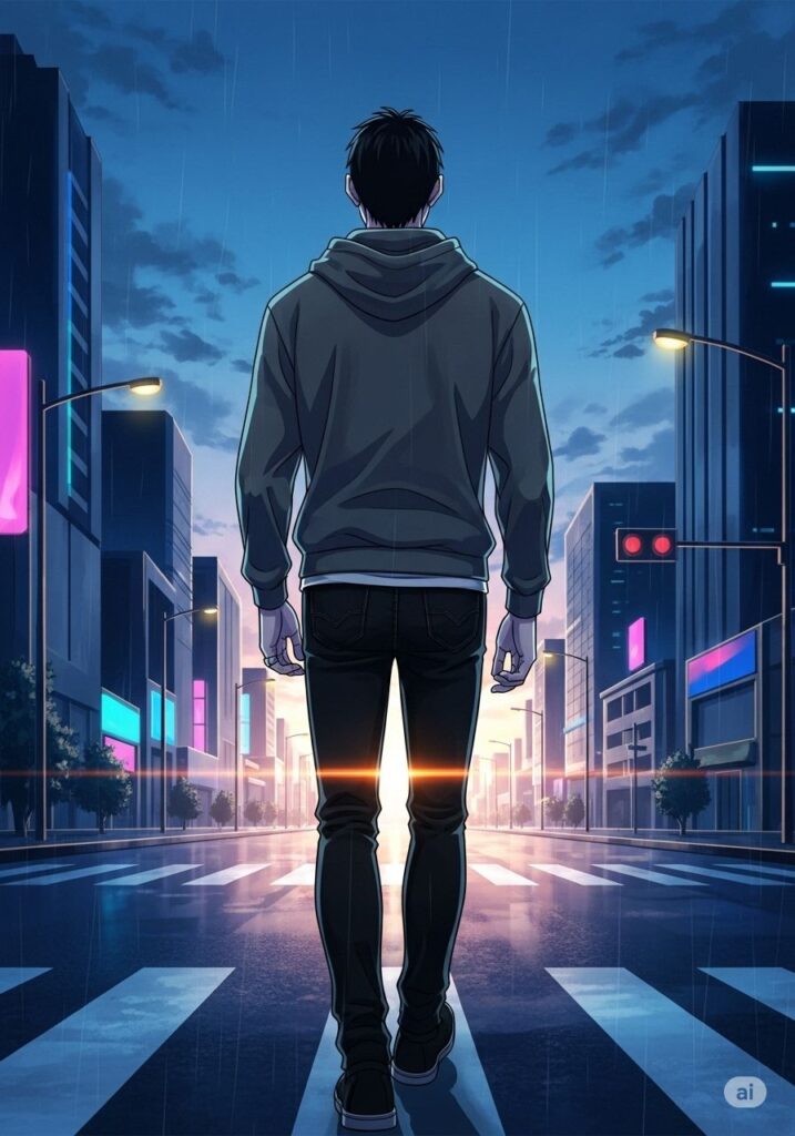 街角の湿った空気の中、ジンは壁に背を預けていた。ネオンの光が水たまりに溶け、出口のない迷路のように彼を閉じ込めている。かつての情熱は色あせ、指先はただ冷たい虚無をなぞるだけだった。