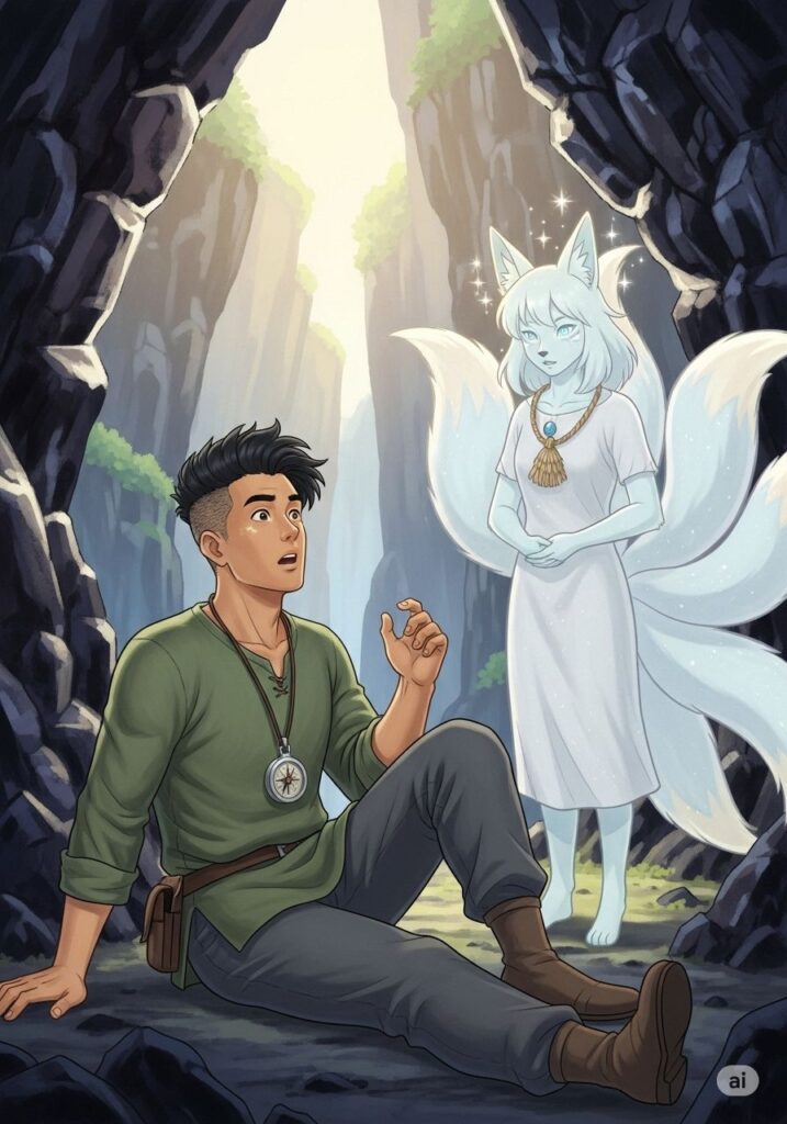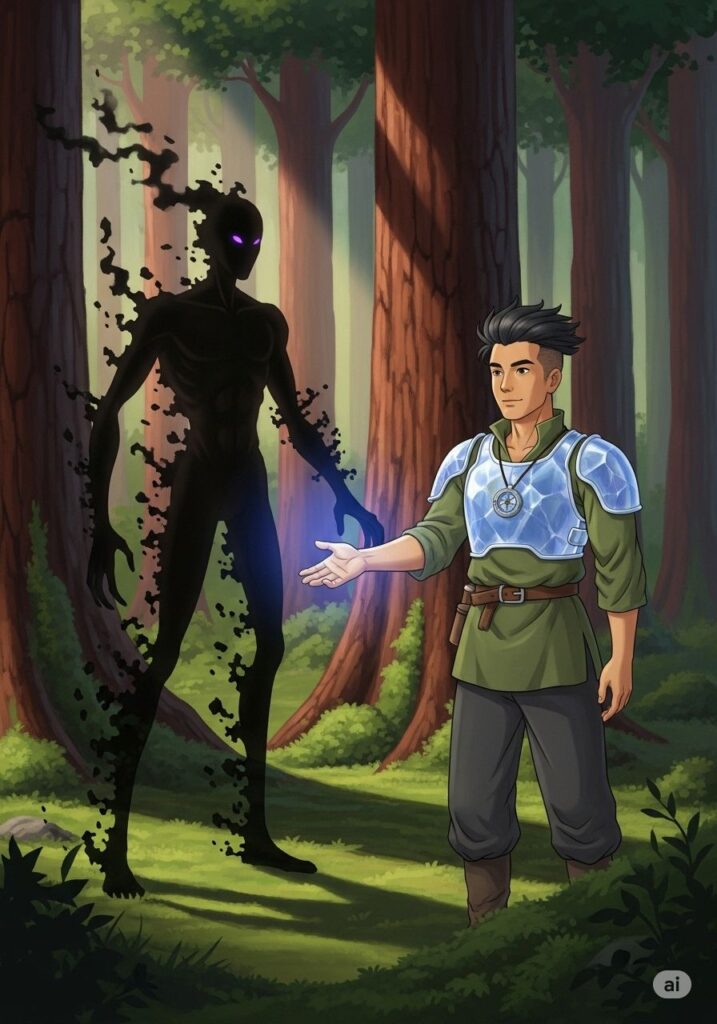 絶望の淵で目を閉じたとき、ヒロシの中に奇妙な感覚が芽生えました。それは、外側の景色ではなく、物事の奥底に流れる真実を捉える力「心眼」の解放でした。目を開けると、そこには不思議な光を纏った精霊シャーが立っていました。