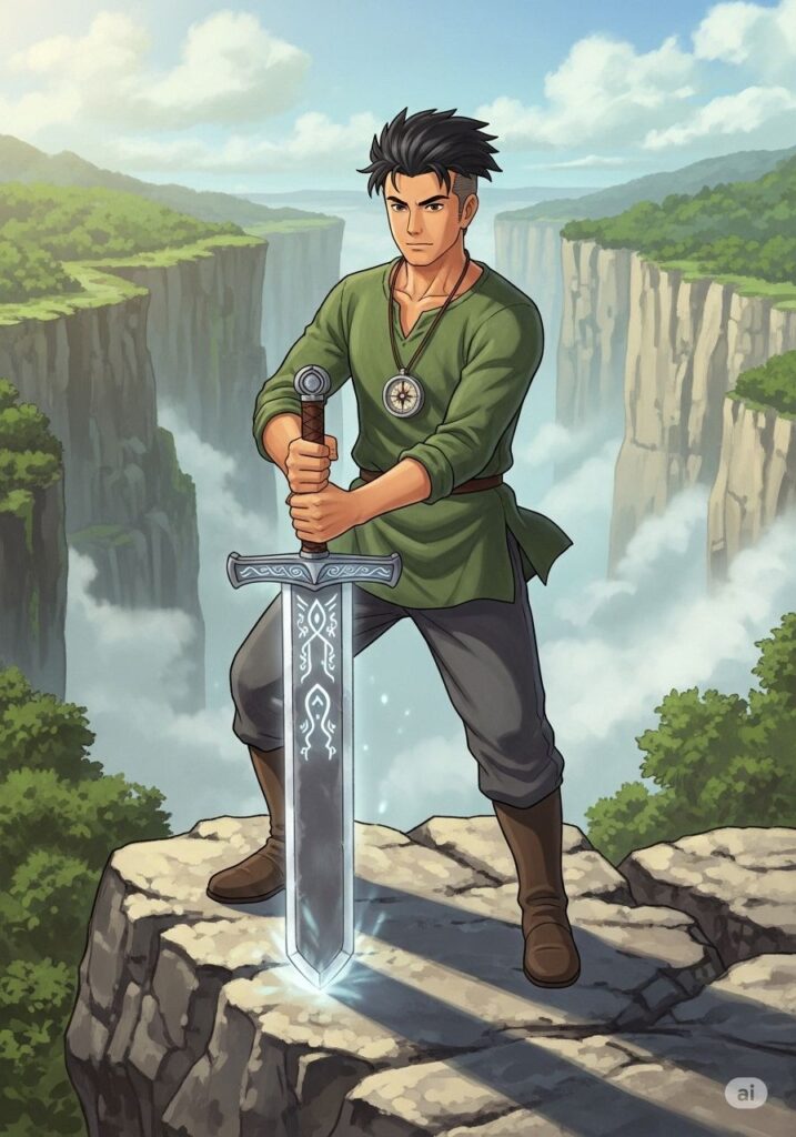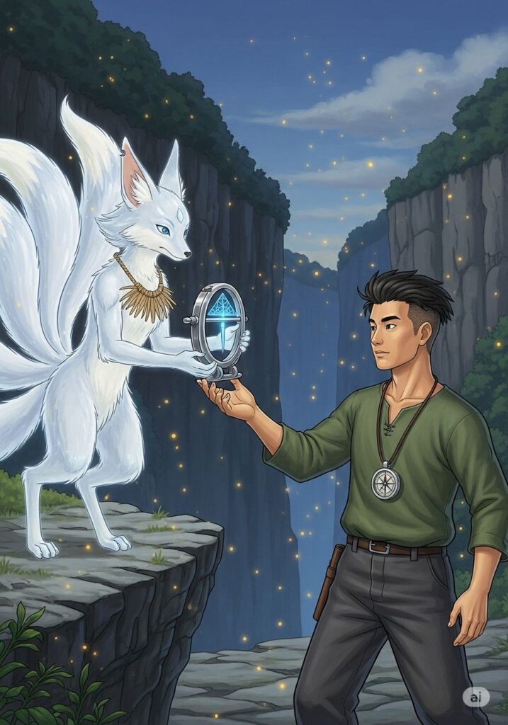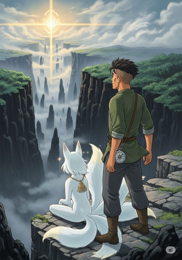 シャーは、古びているが不思議な重厚感のある「シャーのコンパス」をヒロシに手渡しました。「これは進むべき方向を指すのではない。君の魂がどこに向かいたいのか、その真実を映し出す鏡だ」。ヒロシがコンパスを手に取ると、針は迷うことなく、断崖の先にある2026年という遠い光の地点を指し示しました。