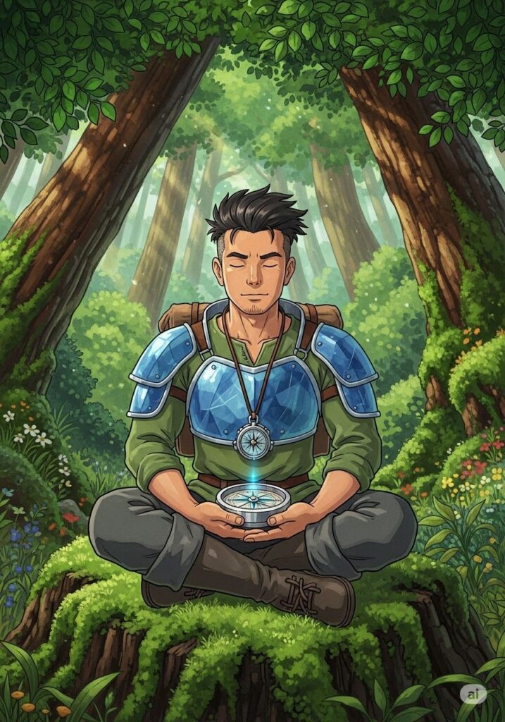 ヒロシは、騒がしい下界の声を遮り、2026年の夜明けを待つために深い森へと入りました。ここでは、誰とも競わず、ただ自分の内側を見つめる時間が流れます。シャーのコンパスが、彼が静寂の中で迷わないよう、常に中心を照らし続けていました。