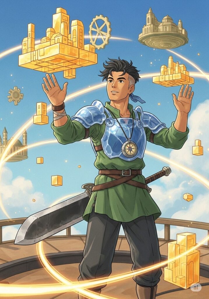 2026年を目前に控え、ヒロシは修練で得た智慧を形にし始めます。彼は空中に浮遊する魔法のブロックを操るように、新しい世界の設計図を描いていきました。一つ一つの行動が剣の重さを消し、一つ一つの事実が鎧の硬度を高めていきます。もはやそこに、かつての迷いはありませんでした。
