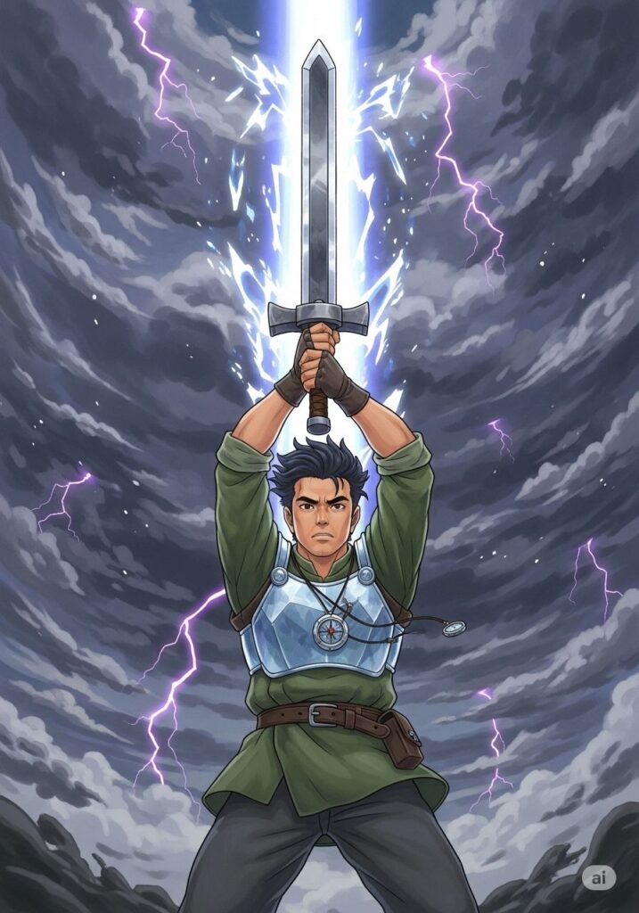 ヒロシは次に、重厚な鉄の輝きを放つ「知行合一の剣」を手にしました。この剣は、ただ振るうだけでは重く、使いこなせません。「思うこと」と「行うこと」が完全に一致した時、初めて羽のように軽くなる不思議な武器です。彼は、自分の口にした言葉の一つ一つを、自らの行動で証明していく決意を固め、剣を強く握り締めました。