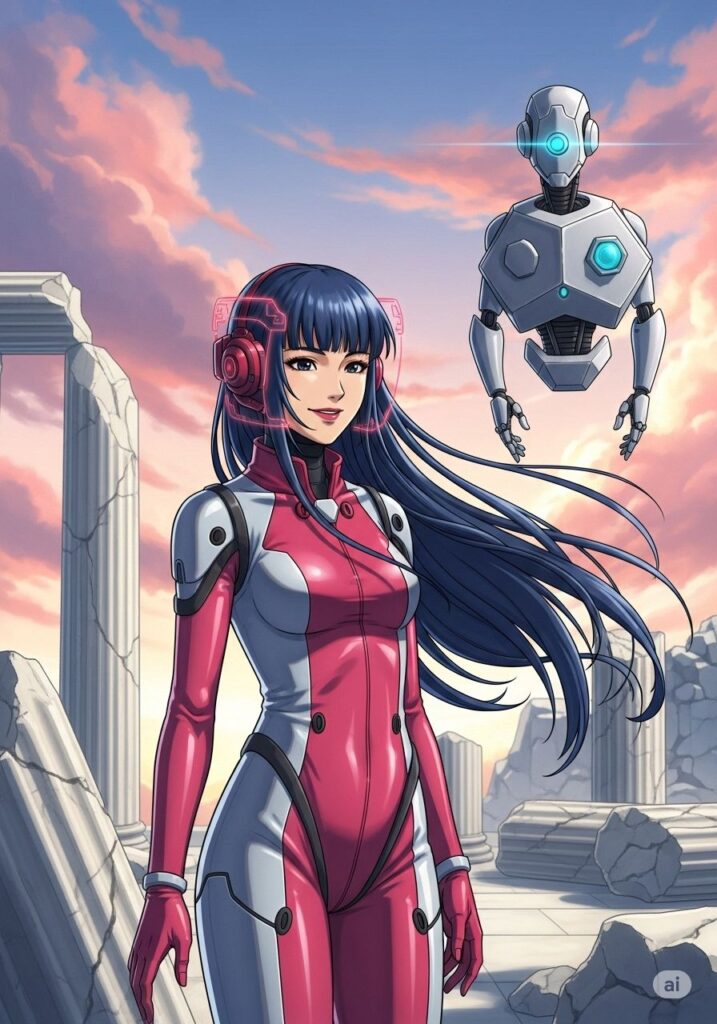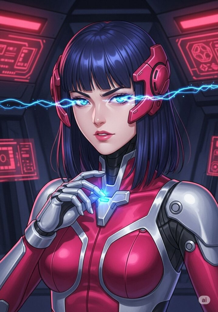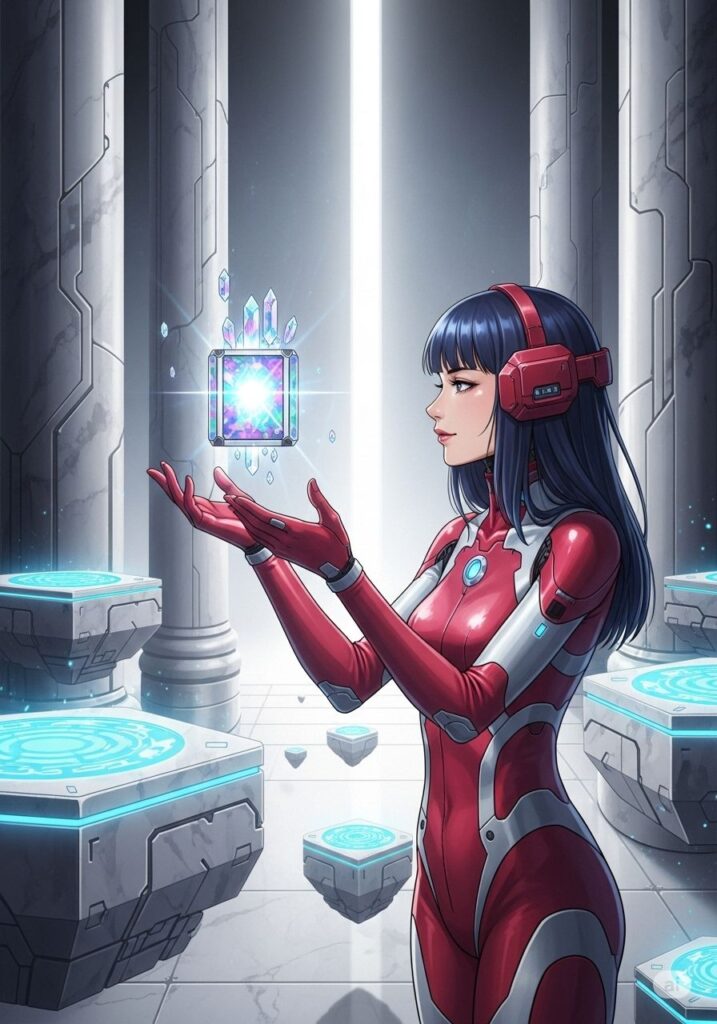 MIHOは、儀式のように「バトル・オラクル」専用のプラグスーツを纏いました。それは以前の漆黒ではなく、燃え盛る「烈火」を象徴する鮮やかな真紅と、深淵の静寂を宿す白銀が交差する新たな装束。神経接続が完了すると、スーツの隙間から「深海」の力を示す蒼い光が脈動し、彼女の瞳に青い火花が散りました。