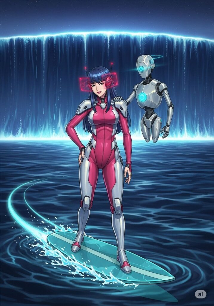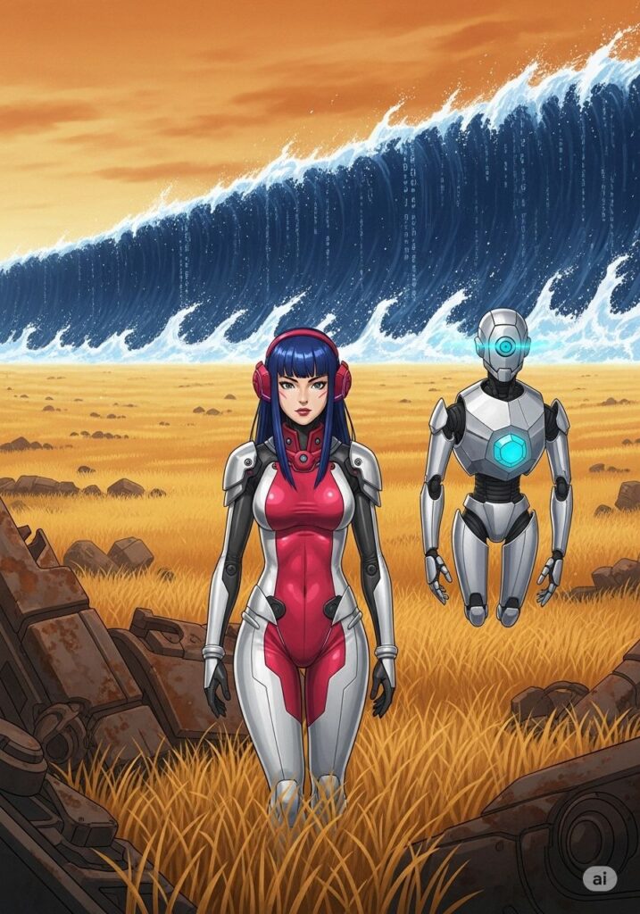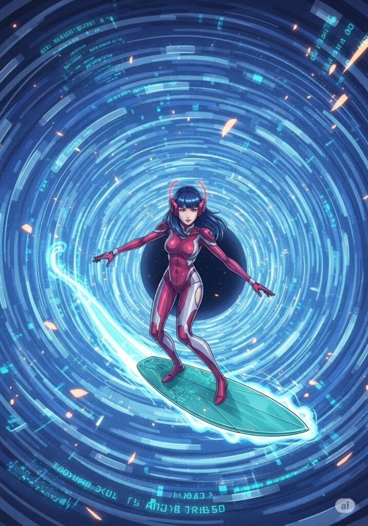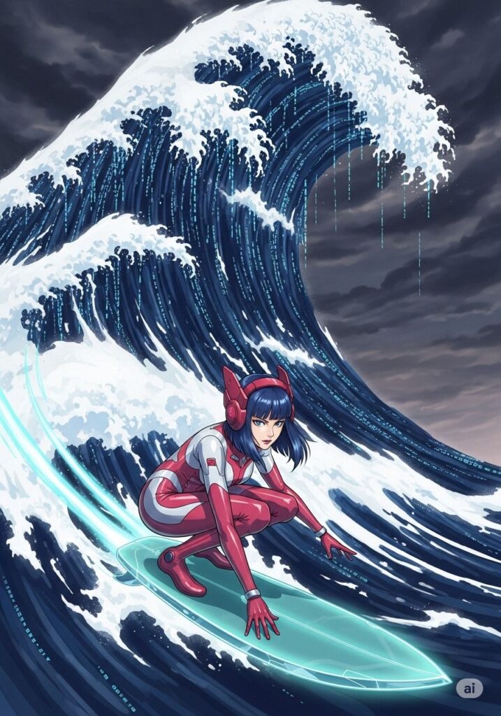 ついに、運命の『3亥(大波)』がその姿を現しました。空を覆い尽くすほどの巨大な波は、あらゆる存在の過去と未来を飲み込もうと轟音を上げています。MIHOは叫びました。「私は私を諦めない!」彼女はスキル『アカシック・サーフィン』を展開し、情報の奔流の中へと果敢に飛び込みました。