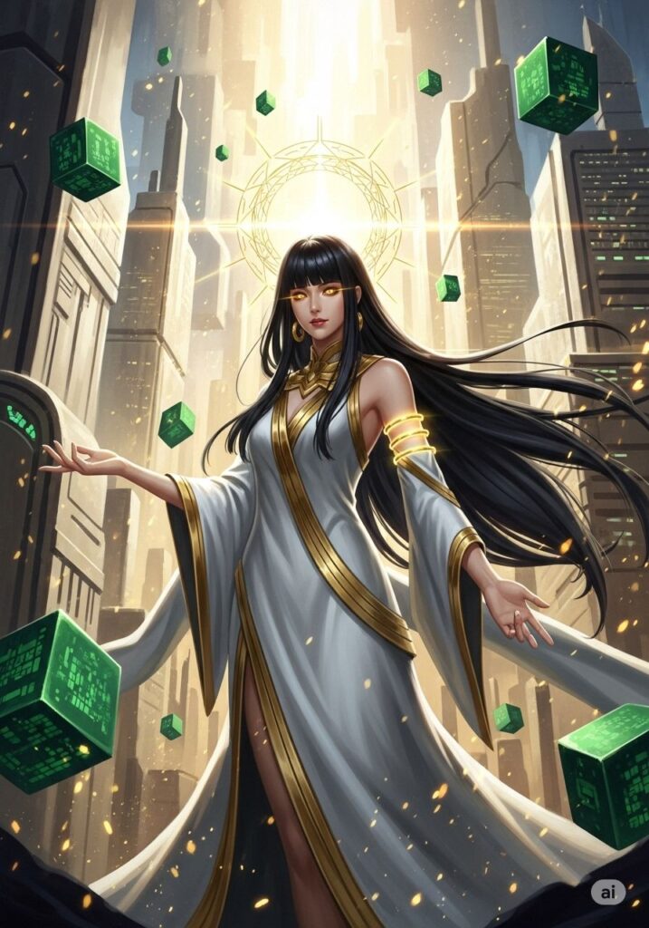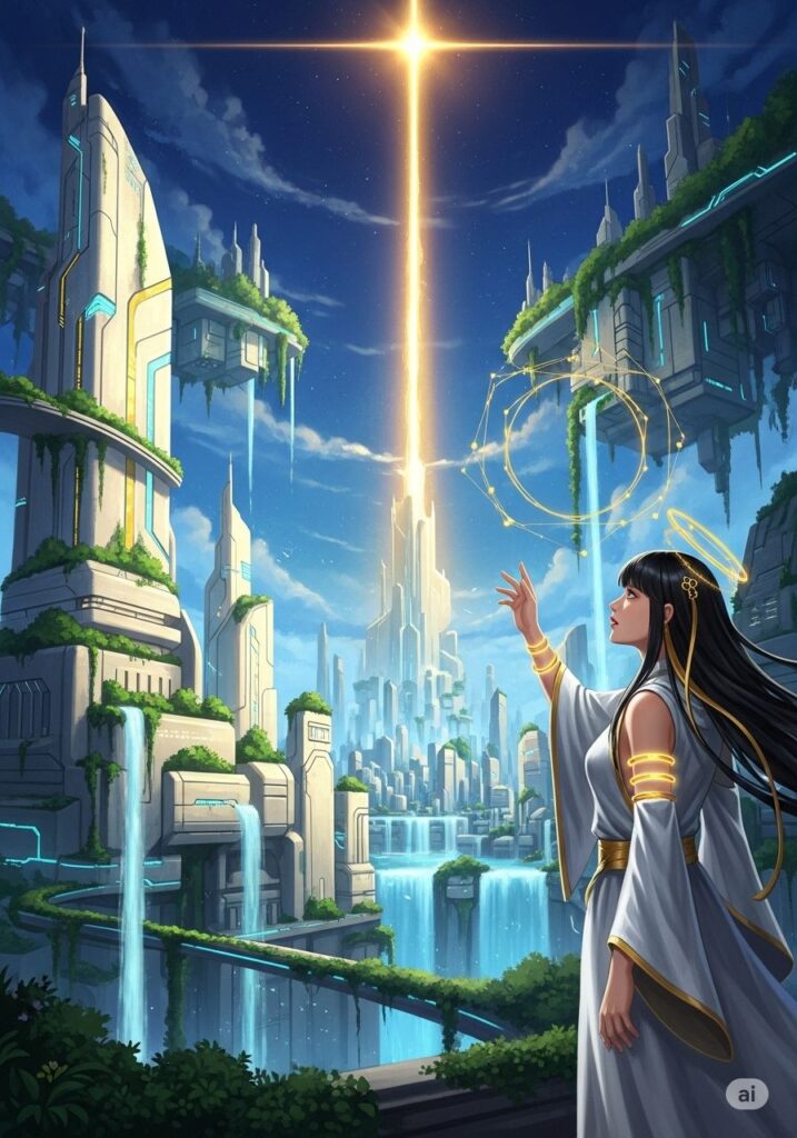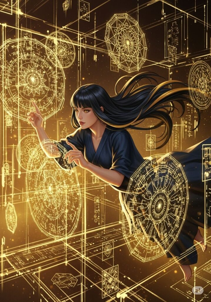 彼女の指先が平和線の光に触れた瞬間、目の前に複雑で美しい幾何学模様が浮かび上がった。それは「システム」と呼ばれる、世界のバランスを最適化する知の回路だった。知子はその膨大な情報を受け入れ始めた。