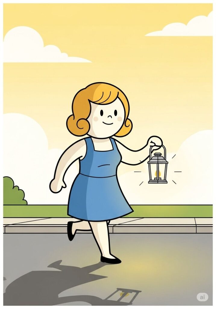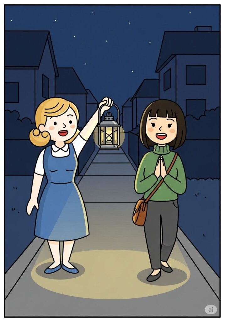 夜の道で、ミーナが道に迷って立ち止まっていました。ゆかりはそっと近づき、自分のランプでミーナの足元を照らしました。