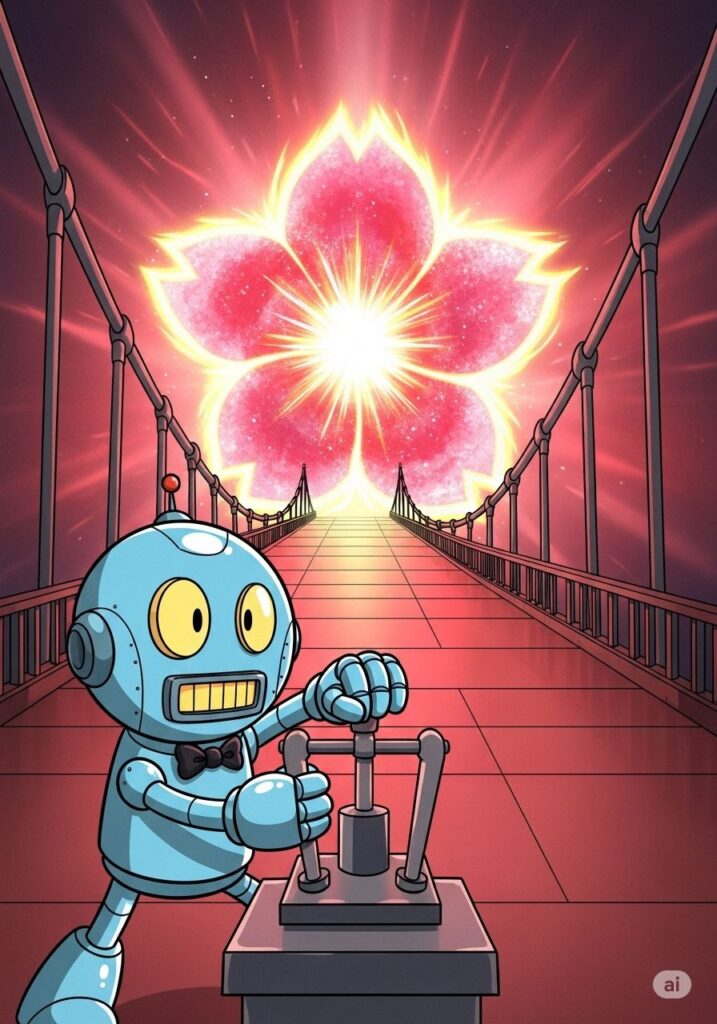 ユキエ号の前方に、巨大な赤い花の形をしたワープゲートが現れました。還暦を祝う「花道セクター」への入り口です。オセロくんがレバーを引くと、船体は真っ赤な光に包まれ、加速し始めました。