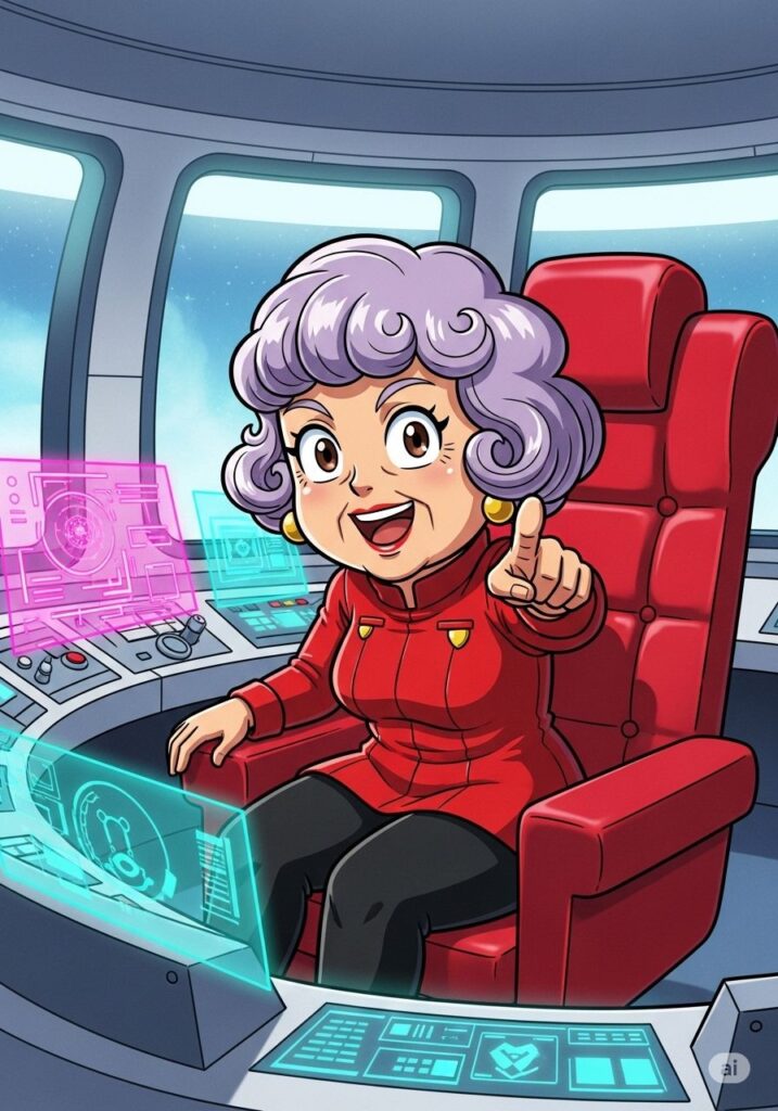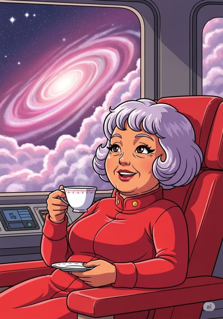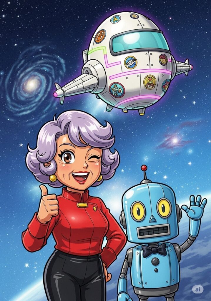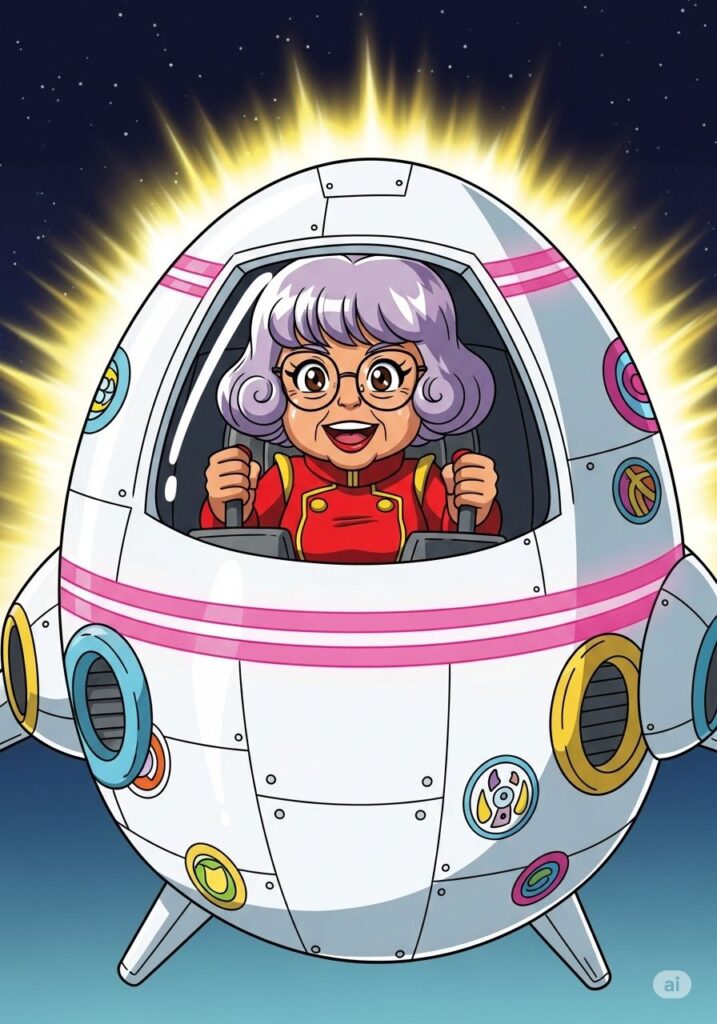 宇宙船ユキエ号のブリッジで、キャプテン幸恵は高らかに宣言しました。丸っこいフォルムの宇宙船は、彼女の華やかな感性を反映して、キラキラのステッカーと派手なネオンでデコレーションされています。