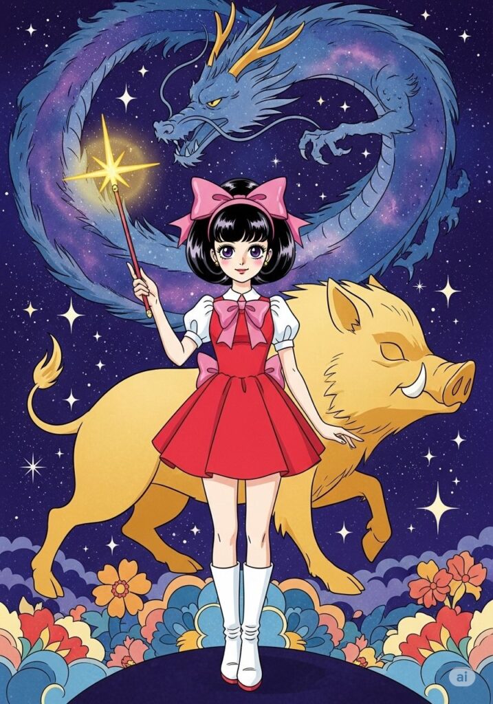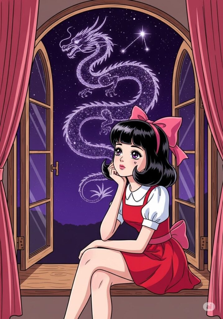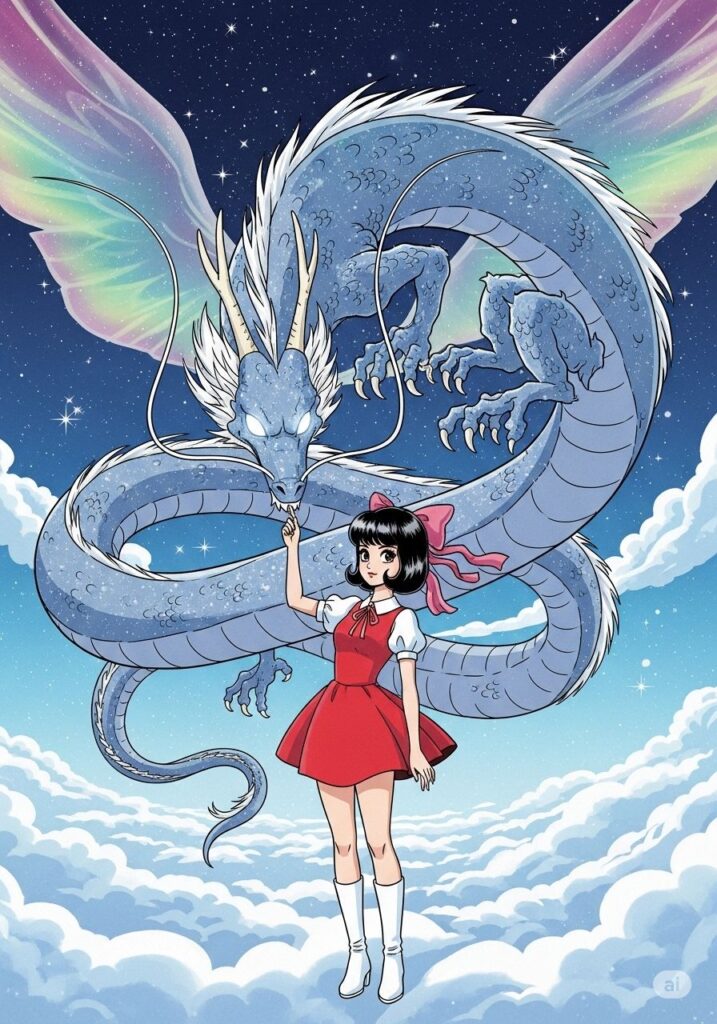 覚醒した三枝子の前に、あの「9:辰」の龍が空から舞い降りました。龍は彼女の瞳を見つめ、静かに頷きました。三枝子はもう、誰かの顔色を伺う少女ではありません。自分の意志で空を飛び、自分の言葉で世界を彩る、一人の自立した魔法使いになったのです。