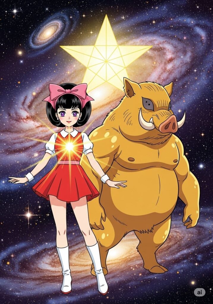 すると、黒い影はまばゆい黄金の光へと姿を変えました。それは彼女の心の奥深くに眠っていた「5:宇宙」の覚醒でした。自分勝手だと思っていた衝動は、実は世界を創り出すための純粋なエネルギーだったのです。三枝子の中心に、自分だけの宇宙が広がり始めました。