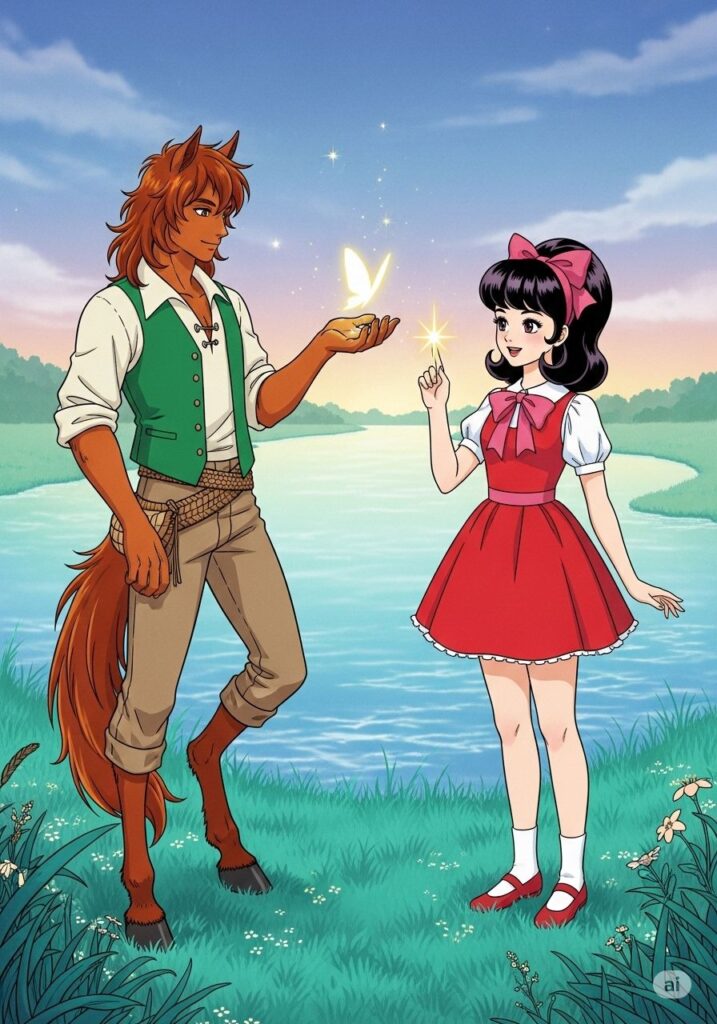 コマは三枝子の手を引き、鏡のように穏やかな湖のほとりへと連れて行きました。そこで二人は、言葉ではなく、魔法の光を交換し合いました。他人の命令に従うのではなく、対等な存在として「交流」することの心地よさを、三枝子は生まれて初めて知ったのです。
