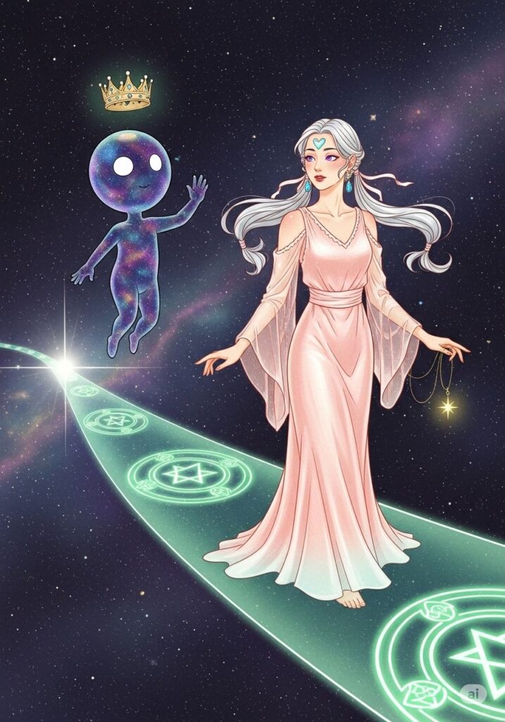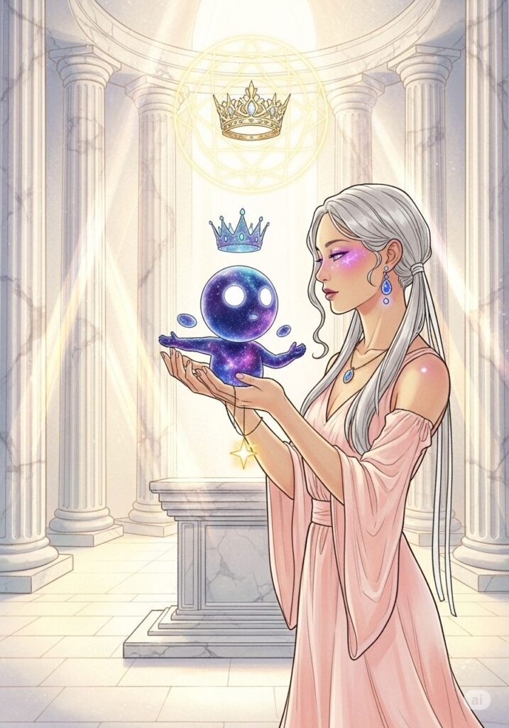 40歳ほどの若々しさと、すべてを包み込むような優しい眼差しを湛えた、真の「聖母」としてのさゆりでした。彼女がただそこに座っているだけで、宇宙の源泉から豊かさが滝のように流れ込み、彼女を満たしていきます。