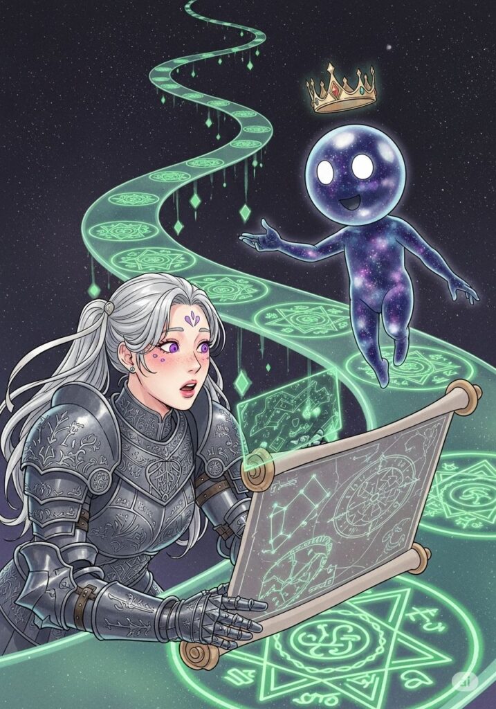 2026年、さゆりの前に不思議な光を放つ宇宙ガイド、シャーが現れました。シャーは九星気学の星々が記された魔法のすごろくマップを広げ、楽しそうに言いました。